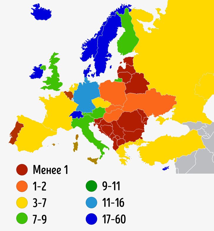 Самые низкие зарплаты зафиксированы в Азербайджане и на Украине (менее € 300 евро), самые высокие — в Дании, Норвегии, Люксембурге, Исландии и Швейцарии (больше € 3 000).Сколько долларовых миллиардеров приходится на 10 млн жителей разных стран