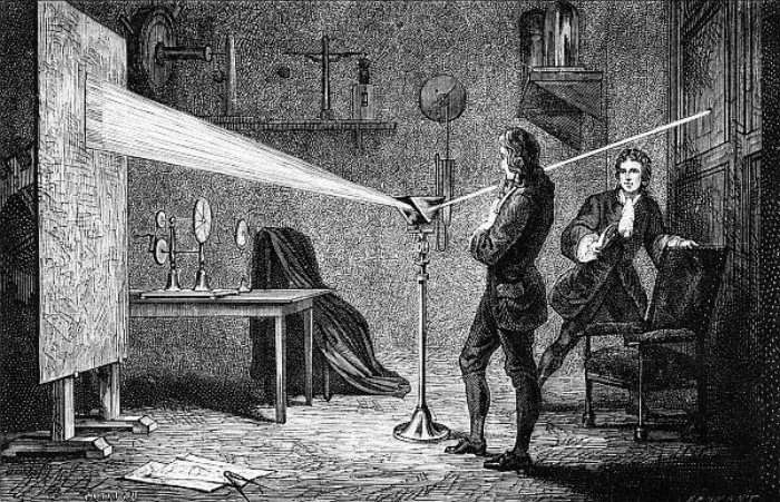 Он изобрел телескоп с зеркалом (отражательный), весьма удобный и очень сильный. Небольшая 15-сантиметровая зрительная трубка Ньютона была так же сильна, как существовавшие до этого времени полутораметровые трубы иной конструкции. Он доказал целым рядом убедительных опытов, что свет, который мы считаем белым, может быть разложен на отдельные цвета — фиолетовый, синий, голубой, зеленый, желтый и т. д. Он подробно исследовал способ распространил звука.