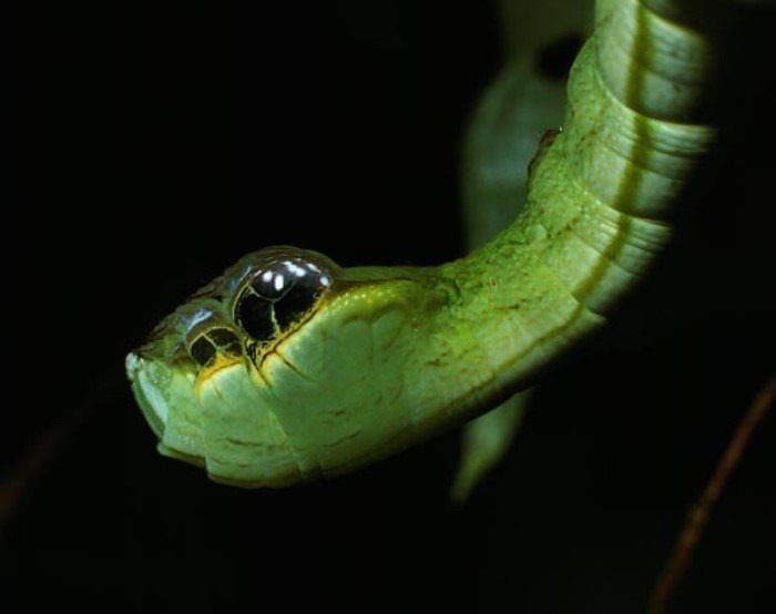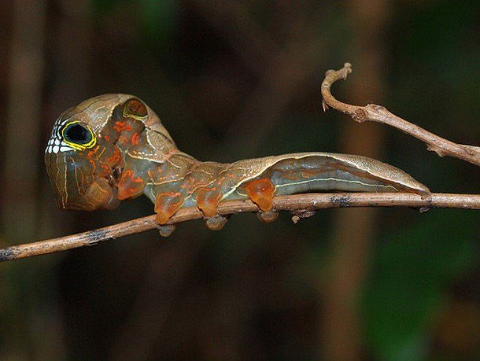 Гусеница-змея. Обитает в тропических лесах Центральной и Южной Америки. Если вы забредёте в колумбийские джунгли, и увидите медленно надувающуюся змею, вернее 1\3 змеи, которая максимально правдоподобно раскачивается и принимает стойку перед укусом — это она. А может и нет. В тропиках и змей много.