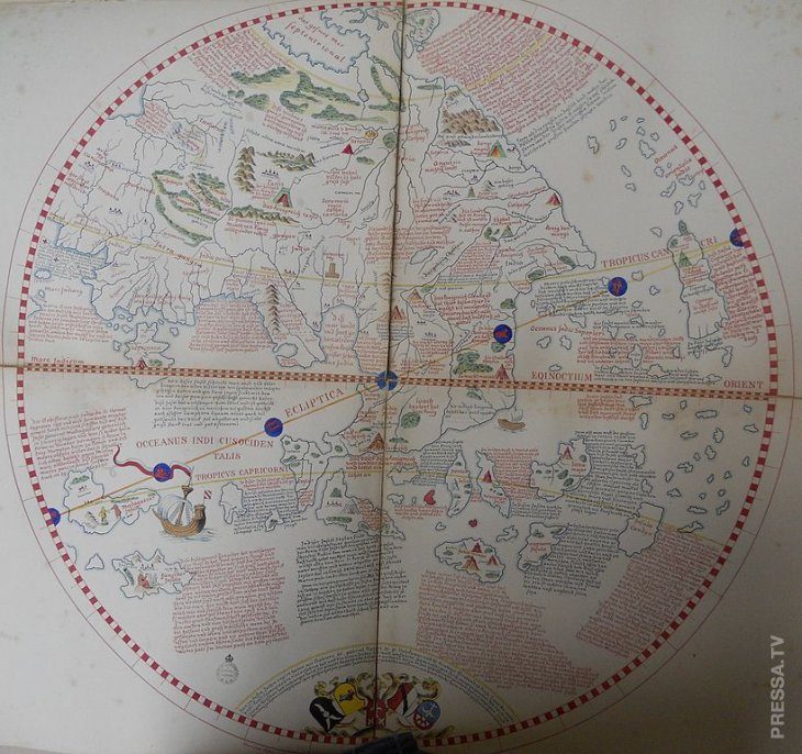 Мартин Бехайм, восточное полушарие земного шара, сделанное в Нюрнберге в 1492 году. Иллюстрация из книги Фридриха Вильхема Гиллани, 1853, «Geschichte des Seefahrers Ritter Martin Behaim».