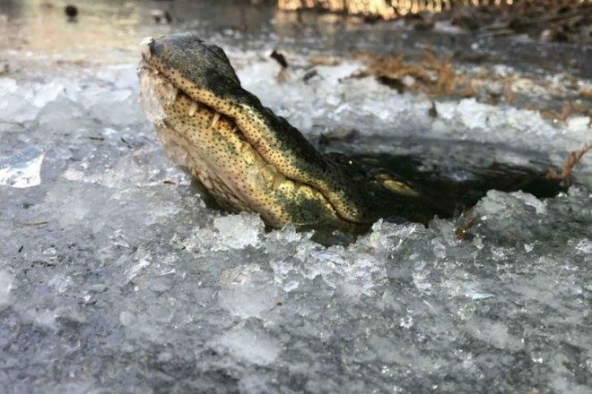 Из-за необычно сильных холодов крокодилы буквально вмерзают в лед, впадая в подобие зимней спячки. А вот ноздри умные рептилии оставляют над водой, чтобы было чем дышать.