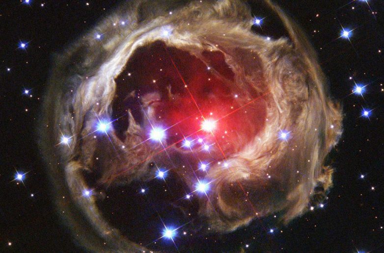 Спирали пыли, циркулирующие по триллионам километров межзвездного пространства, видны в ореоле света от красного сверхгиганта V838 Единорога. V838 расположена на расстоянии 20 000 световых лет от Земли на внешнем краю нашей галактики © NASA, the Hubble Heritage Team, AURA / STScI, and ESA