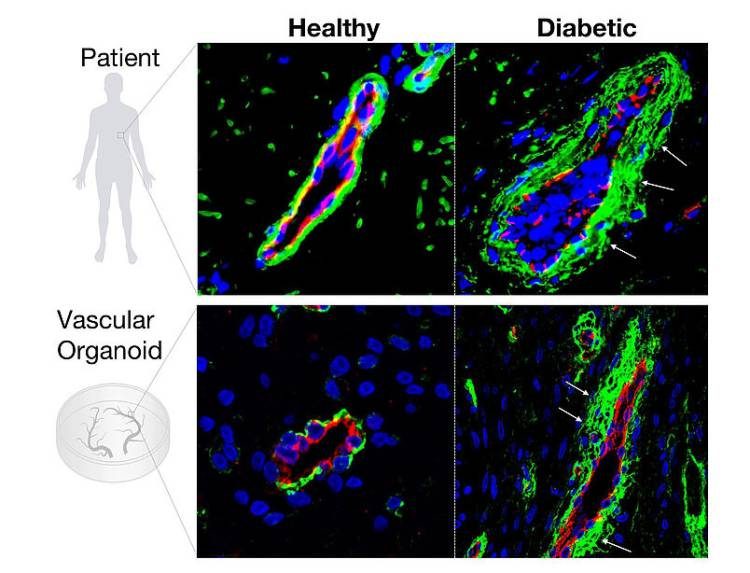Сравнение изменения кровеносных сосудов: у человека и лабораторно созданных сосудистых органоидах. Базальная мембрана (отмечена зеленым) вокруг кровеносных сосудов (красным) значительно увеличена у пациентов с диабетом (указано белыми стрелками)Авторы работы отмечают, что органоиды сосудистой системы человека были выращены на основе стволовых клеток – незрелых клеток, способных принимать форму любых других. Как и в случае настоящей сосудистой системы человека, созданные органоиды обладает сетью капилляров, покрытых базальной мембраной, представляющей собой прослойку, отделяющую соединительную ткань от эпителия или эндотелия и выполняющую структурную функцию, придавая и поддерживая форму кровеносным сосудам.