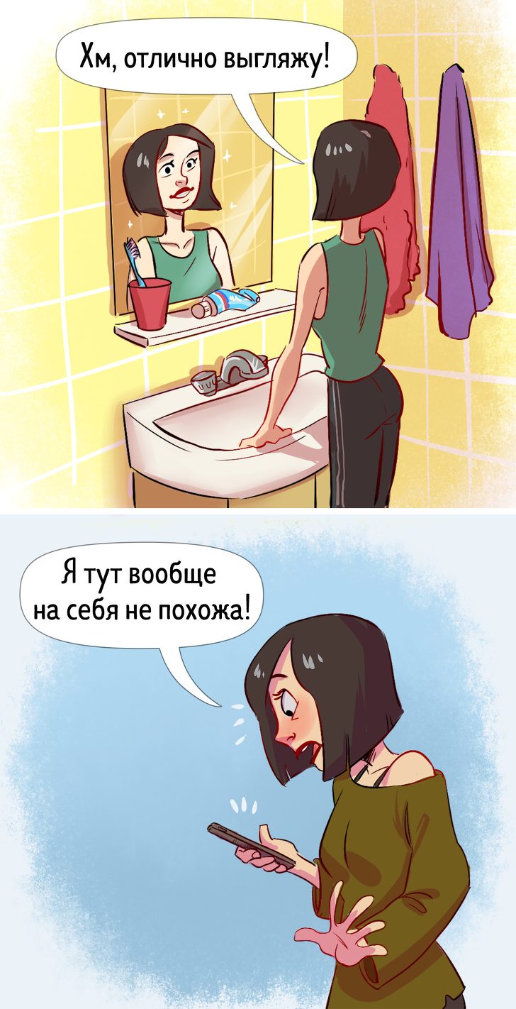 Объясняется все достаточно легко: мы привыкли к своему необъемному и оттого немного искаженному изображению в зеркале. А то, к чему человек привык, обычно вызывает у него симпатию — мозг не особо любит сюрпризы. Поэтому нам не нравятся наши фотографии, ведь они сделаны практически в 3D, и потому на них лучше видна природная несимметричность наших лиц и тел.