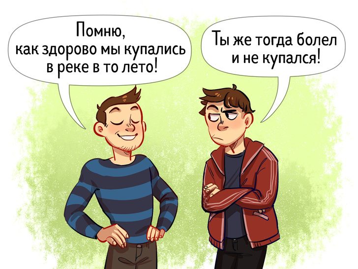 Иногда наш мозг «присваивает» воспоминания, которых на самом деле никогда не было. Такая его способность называется конфабуляцией. Мы с полной уверенностью можем рассказывать о каком-то эпизоде из детства, при этом даже не подозревая, что ничего подобного не было.