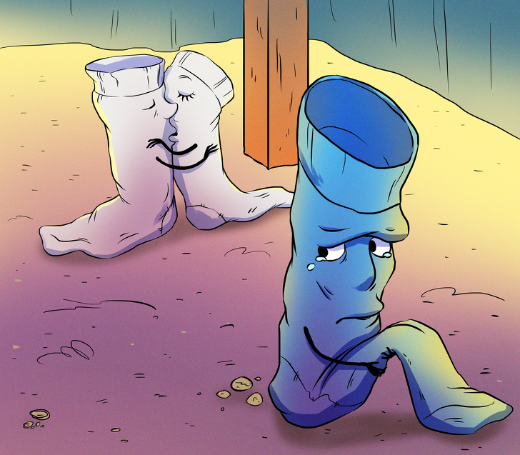 Он оживился и сказал: „Смотри, надеваю я носки, а один из них оказывается дырявым — я его выбрасываю, а второй выбрасывать жалко, он же целый, да и чистый к тому же. Я кладу его на место, а так как ты периодически покупаешь одинаковые носки, то со временем по этой же схеме ему находится пара — такой же износостойкий экземпляр. Но найти новую „вторую половинку“ получается не у всех, поэтому некоторые из них так и продолжают влачить свое жалкое существование в одиночестве“».