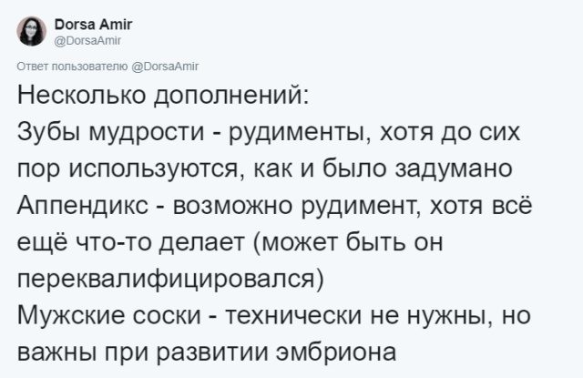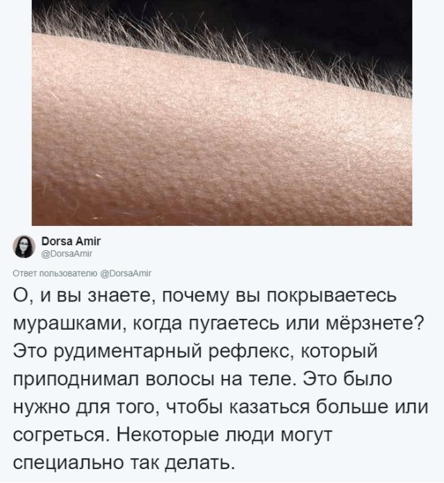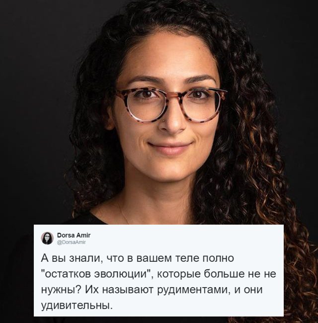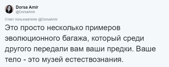Тело человека – это настоящий музей естествознания, о чем в очередной раз напоминает нам пост Дорсы Амир, которая работает в Бостонском университете на кафедре психологии. Девушка занимается эволюционной антропологией, а еще ведет познавательную страничку в социальной сети, на которой можно узнать немало интересных фактов о человеческом теле.