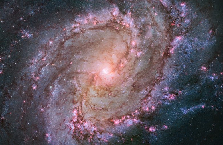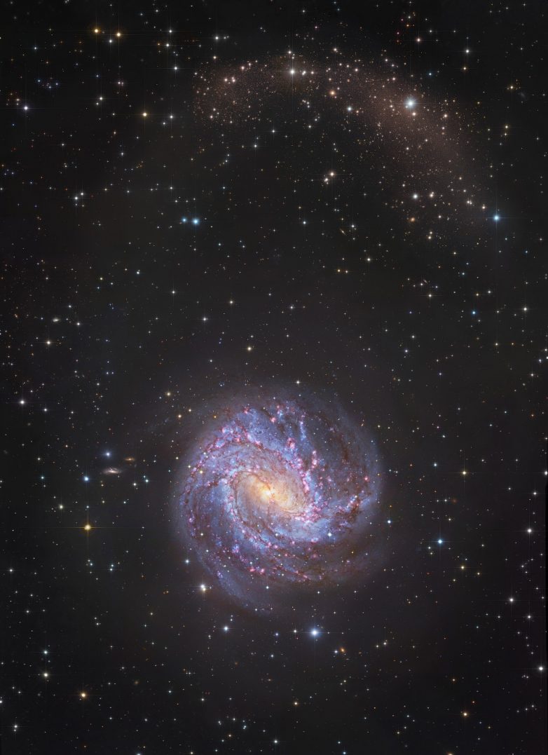 Это спиральная галактика M83 с перемычкой в созвездии Гидра, известная как Южная Вертушка. Она находится на расстоянии приблизительно 12 миллионов световых лет от нас. В галактике было зарегистрировано шесть сверхновых.Сверхновые звезды — звезды, блеск которых при вспышке увеличивается на десятки звёздных величин в течение нескольких суток. В максимуме блеска сверхновая сравнима по яркости со всей галактикой, в которой она вспыхнула, и даже может превосходить её.