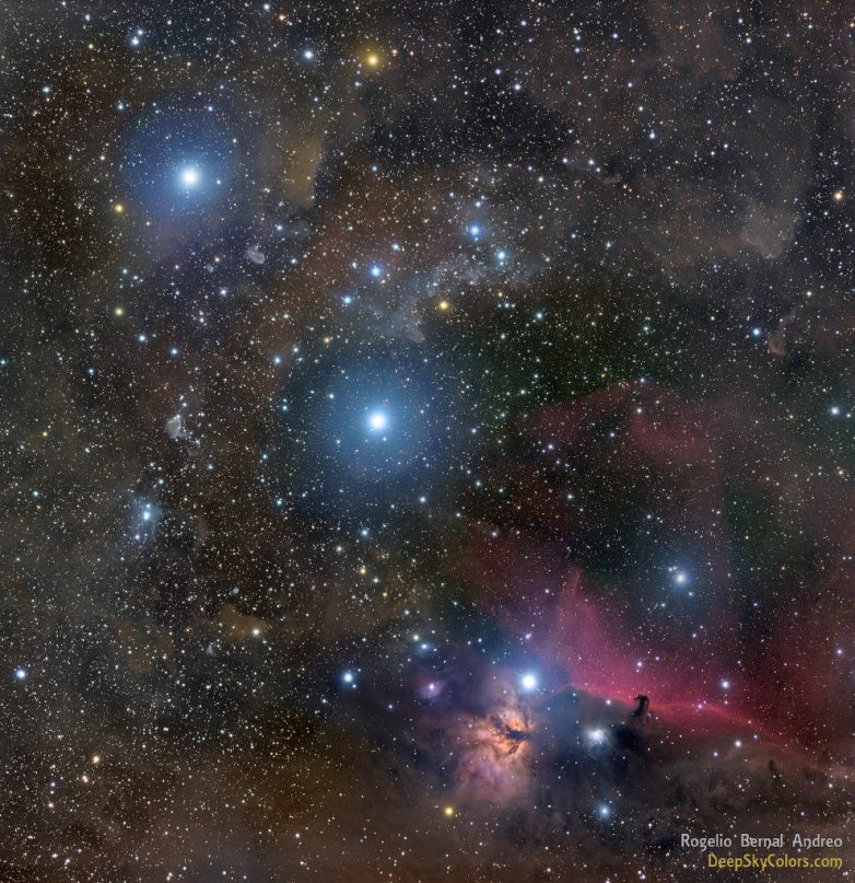 Красивый космический пейзаж. Альнитак, Альнилам и Минтака — три яркие голубые звезды, расположенные по диагонали из нижнего правого угла в верхний левый. Более известные как Пояс Ориона, эти три голубых сверхгиганта гораздо больше и горячее нашего Солнца. Они находятся на расстоянии около 1 500 световых лет от Земли. Сама туманность Ориона находится чуть правее, за пределами кадра.