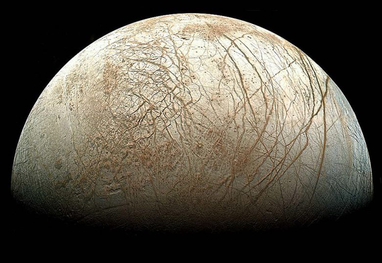 Это Европа — спутник гиганта-Юпитера. На снимке, полученным автоматическим космическим аппаратом Галилео, видны равнины из светлого льда. Размерами Европа похожа на Луну, но ее поверхность гораздо ровнее.