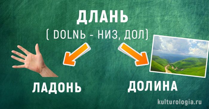 История возникновения доказывает, что перед нами однокоренные слова. Как и в ситуации с “пчелой”, слово ладонь в незапамятные времена звучало несколько иначе: долонь или длань. Образовалось оно от праславянского корня *dolnь со значением “низ, дол”. Название части тела буквально переводилось “обращённая вниз, к долу”. Исторически первые два слога поменялись местами, затем под воздействием законов редукции буква о перешла в а. Так появилась современная словоформа ладонь.