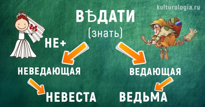 Кроме того, что оба существительных обозначают лиц женского пола, у слов имеется ещё одна тесная связь — происхождение от старославянского глагола вѣдати (“знать”). Только лексема невеста возникла как отрицание (не + ведать), то есть “незнакомая, неизвестная”, а ведьма — как утверждение, “ведающая”. Заложенный в слово “невеста” смысл обусловлен обычаем сватовства, когда родители или сваты договаривались о заключении брака зачастую между незнакомыми друг с другом парнем и девушкой. Поэтому, когда в дом приводили будущую жену, она была неизвестна жениху. А ведьмой называли колдунью, владевшую магическими знаниями.