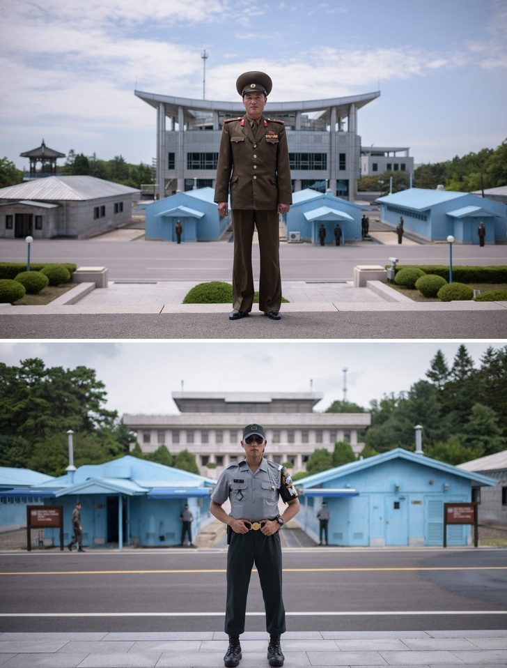 Так выглядит демилитаризованная зона между двумя Кореями. На этом фотоколлаже вы видите пограничников лейтенанта Кима из КНДР (сверху) и капрала Ву из Южной Кореи (внизу).
