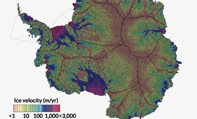 Новая карта, основанная на спутниковых радиолокационных данных, показывает скорость ледяного потока через Антарктиду. Так называемый внутренний лед движется невероятно медленно. Большая часть его растекается со скоростью менее 10 метров в год.