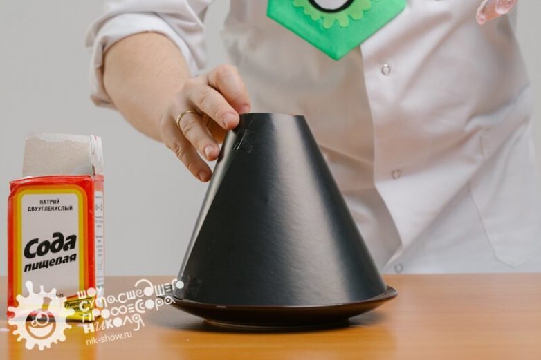 Комментарий профессора Николя: «В результате взаимодействия уксуса с содой возникает настоящая химическая реакция с выделением углекислого газа. А жидкое мыло и краситель, взаимодействуя с углекислым газом, образуют цветную мыльную пену — вот и извержение».