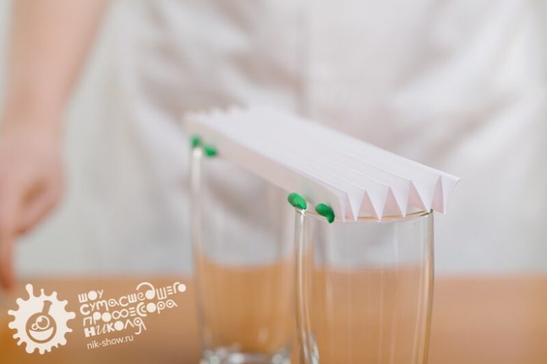 Комментарий профессора Николя: «Мы провели настоящую инженерную работу. Согнув листок бумаги гармошкой, мы создали так называемые ребра жесткости, которые и придали прочность всей конструкции, что позволило мосту выдержать вес даже стакана с водой! Здорово!»