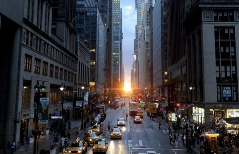 На Манхэттене четыре раза в год, в декабре, январе, мае и июле, происходит явление, получившее название Манхэттенхендж. На улицах, которые идут под углом 29° к меридианам, можно увидеть, как заходит или поднимается солнце. Подобное явление также можно наблюдать и в других городах, имеющих аналогичную планировку улиц, например, в Балтиморе, Чикаго, Торонто и Монреале.