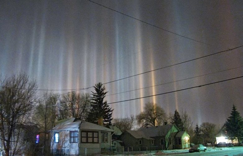 При низких температурах и определенном атмосферном давлении могут образовываться световые столбы. Их создают крошечные кристаллы льда, плавающие в воздухе, которые отражают под определенным углом солнечный свет.