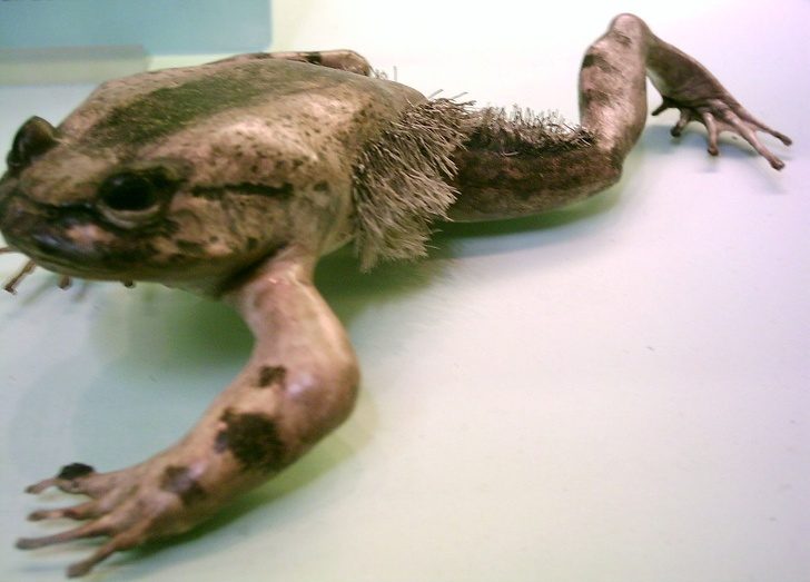 В случае опасности волосатая лягушка ломает кости фаланг и выводит их через кожу, создавая когти