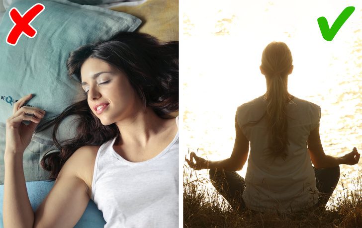 Вряд ли вы будете сидеть прямо, если перестанете думать об осанке, а сядете так, как вам удобно. То есть вы напрягаетесь, чтобы выпрямиться и держать спину так, как «принято». Со временем это гарантированно приведет к боли, а исправить осанку можно более эффективными и естественными способами, например заняться фитнесом или йогой.8. Медитация лучше отдыха