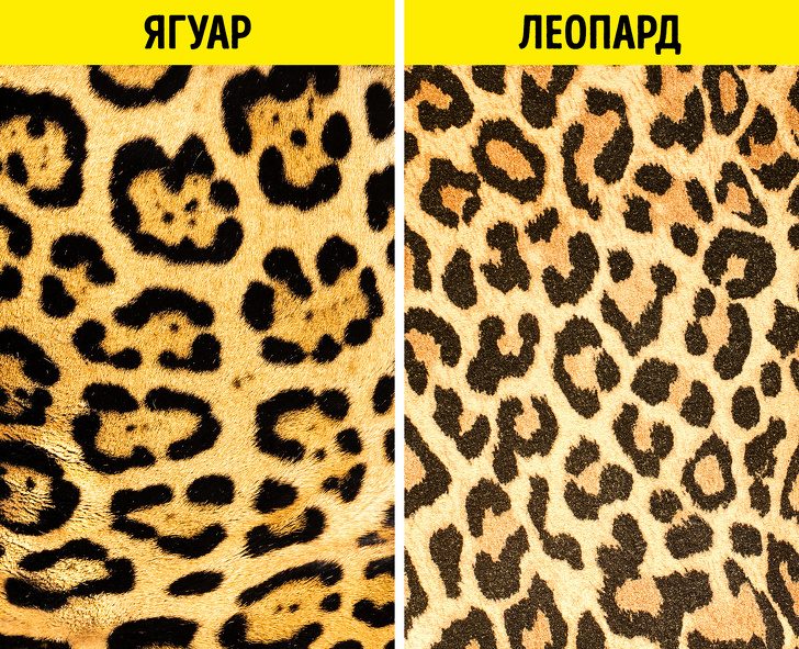 У ягуаров пятна на шкуре собраны в розетки с пятнышками в центре. А кружочки на шкуре у леопарда, во-первых, поменьше, а во-вторых, пустые внутри. Морда у леопарда более приплюснутая. Ягуар заметно крупнее леопарда в целом, и хвост у него длиннее.Ягуар водится в Северной и Южной Америке, а леопард — в Африке, Азии и на Дальнем Востоке. Так что в природе эти животные не встречаются друг с другом. А еще ягуар сильнее и агрессивнее леопарда, он бесстрашно охотится на крупных животных и любит плавать, как тигр.