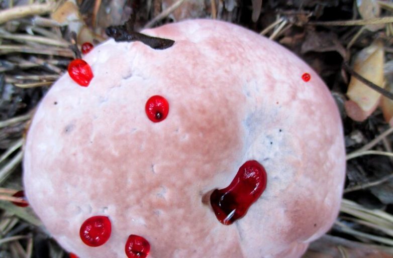 Зубы дьявола, или кровоточащие зубы, или Гиднеллум Пека, или Ежовик — жутковатый симбиот хвойных деревьев родом из Северной Америки. Помогает, по больше части, соснам, переваривая органику и отдавая их корням минеральные вещества. Алые «капли крови» — уникальное вещество, атроментин, природный пигмент ярко-красного цвета. Уникально оно своими свойствами — сегодня его активно изучают, и, помимо возможностей по антикоагуляции, уже открыли антибактериальный эффект и стимуляцию гладких мышц.