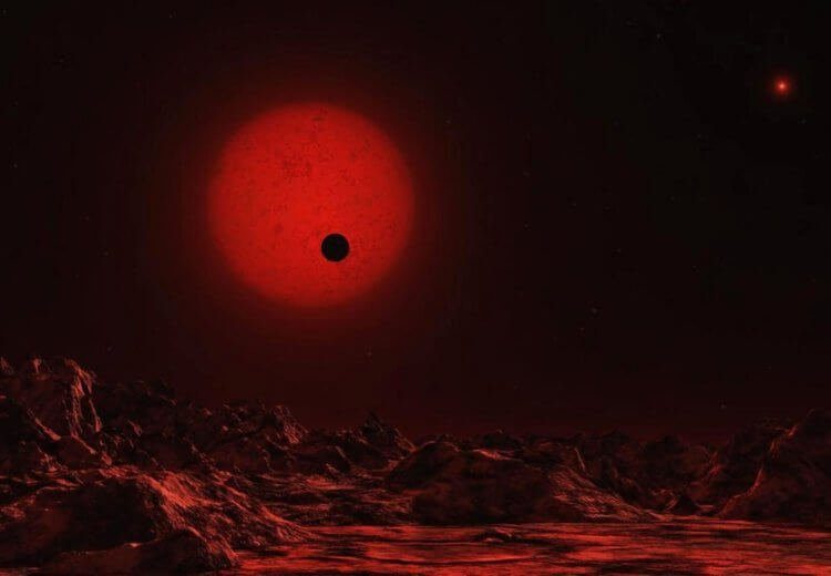 Вид с поверхности расположенной у красного карлика планеты в представлении художника