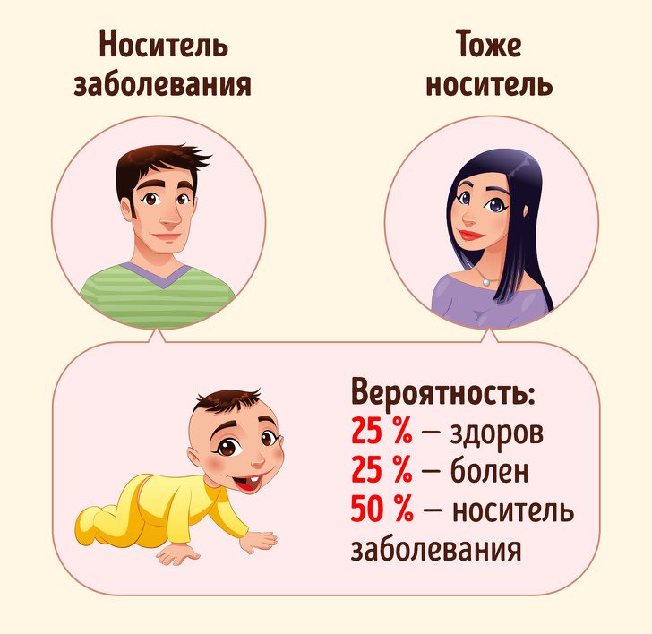Так выглядит схема передачи некоторых генетических заболеваний, например муковисцидоза и тугоухости.