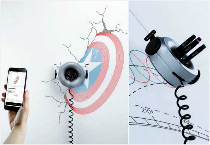 Ваши дети наверняка не раз порывались разрисовать стены в квартире, но получалось всегда не очень, а возможно, вы и сами, чувствуя в себе художественный талант, пытались создать на стене какое-то произведение искусства и знаете насколько это трудоемкий процесс. А вот для подвесного робота Scribit — это раз плюнуть. Вы просто выбираете в мобильном приложении нужный рисунок и включаете устройство. В процессе работы робот использует сразу 4 маркера, а готовый рисунок остается на стене 3-4 недели.