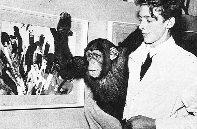 «Он взял карандаш, а я положил лист бумаги перед ним… Что-то странное выходило из-под карандаша. Это была первая линия Конго. Он провел коротенький отрезок и остановился. Продолжит ли он? Произойдет ли это еще раз? Но он повторял это снова и снова», — вспоминает исследователь Десмонд Моррис, который изучал самца шимпанзе по имени Конго. Обезьяна с раннего возраста демонстрировала интерес к рисованию: всего за два года Конго нарисовал 400 картин. Поначалу животное, как и любые другие шимпанзе, просто разбрызгивало краски, но в один прекрасный момент манера держать кисть сильно изменилась, как и отношение к своим занятиям. Конго стал гораздо внимательнее, вырисовывая каждый мазок.