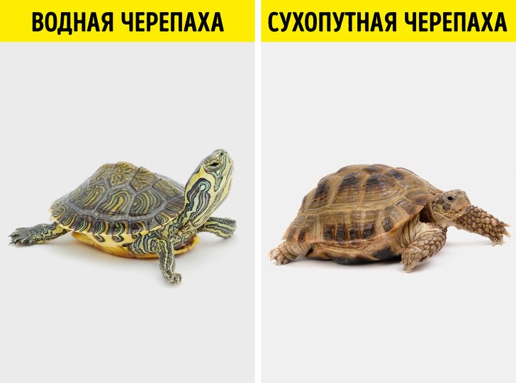 Морские и сухопутные черепахи на первый взгляд похожи, но их жизненные привычки сильно различаются. Морские предпочитают воду, но могут жить как на суше, так и в воде. Сухопутные перемещаются активнее морских, предпочитают растительную пищу и слабо приспособлены к плаванию.