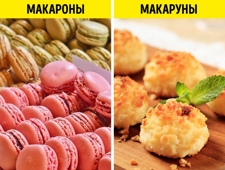 Макароны — это французские сэндвич-печенья со сливочной начинкой и разными вкусами. Макаруны, в свою очередь, готовятся из тертого кокоса и не содержат начинку.