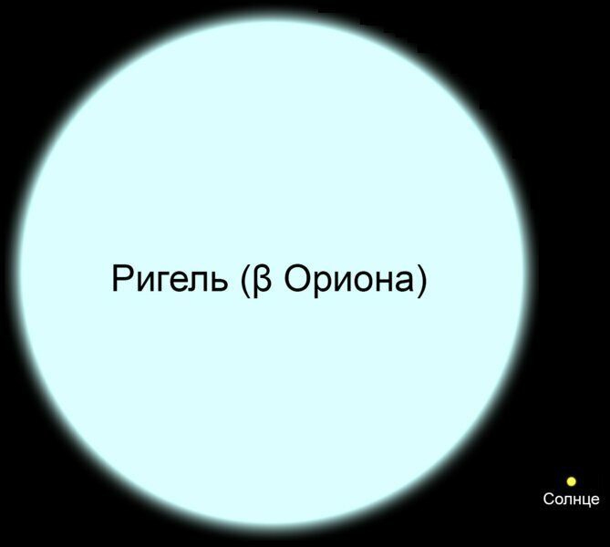 Ригель – Самая заметная звезда, в созвездии Ориона. Она является седьмой самой яркой звездой на небе. Она в 12 000 раз ярче Солнца. Ригель наиболее заметен зимой в северном полушарии и летом на юге. Расстояние от Земли составляет 850 световых лет. Примерно в 80 раз больше Солнца, радиус которого составляет приблизительно 54 250 000 км. Температура поверхности составляет приблизительно 11 000 градусов.