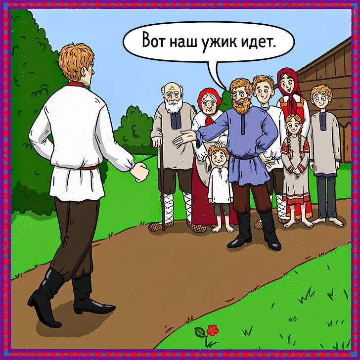 Ужик, или южик, — родственник, родня. «Где братья и друзи, где сердоболи и ужики!» — говорится в книге «Русский феодальный архив». Вероятно, «ужик» берет свои истоки от слова «узы», или «узел», то есть обозначает человека, связанного родственными узлами, или узами.13. Болван