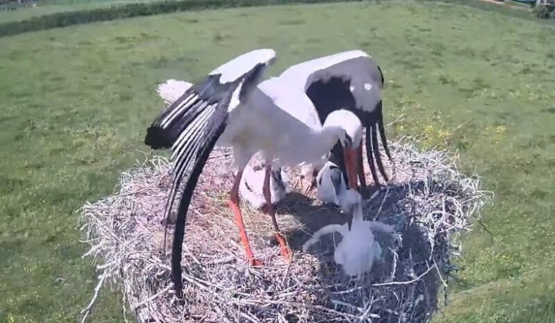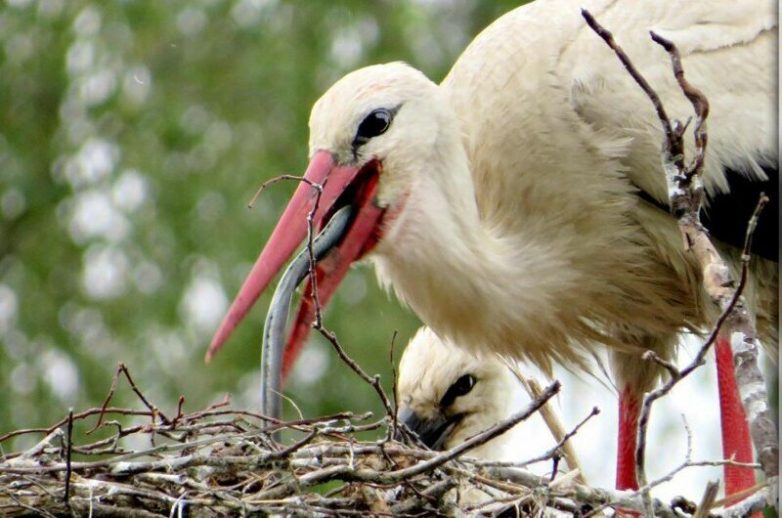 К этому времени родители больше не выбрасывают своих птенцов из гнезда, а приносят в дом чужих. В рацион молодых аистов помимо холоднокровных тварей входят как мелкие птахи, так и их птенчики.