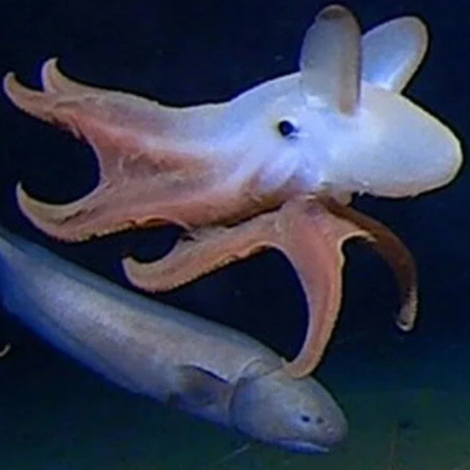 Находка была сделана в ходе экспедиции, которая проходила в 2019 году. Она была посвящена обследованию самых глубоких мест пяти океанов. Во время погружения в Зондском желобе Индийского океана, максимальная глубина которого превышает 7 000 метров, и были обнаружены необычные головоногие моллюски. Да, осьминог бы не один — это были две особи, которые попали в объектив камеры дважды. Обнаруженные беспозвоночные относятся к роду Grimpoteuthis; их еще называют «осьминоги Дамбо», плавники по бокам их мантии напоминают уши слоненка из одноименного мультфильма. При этом если первый осьминог попал в объектив на глубине почти 5 800 метров, что тоже немало, то второй забрался гораздо глубже — на 6 957 метров.