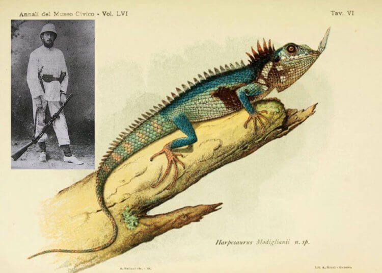 В конце XIX века итальянский исследователь Элио Модильяни (Elio Modigliani) отправился на остров Суматра. Этот огромный клочок земли считается частью Индонезии и славится густой тропической растительностью, а также обилием диких животных и дымящихся вулканов. Исследователь собрал там множество видов растений, выловил экзотических животных и привез их в Европу для изучения. Среди пойманных животных оказались удивительные ящерицы, у которых на носу росло нечто вроде рога.