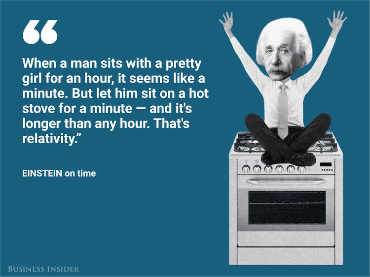 Перевод: Когда мужчина сидит с красивой девушкой в течение часа, это кажется минутой. Но пусть он посидит на горячей плите минуту — и она покажется ему длиннее, чем любой час. Это и есть относительность.