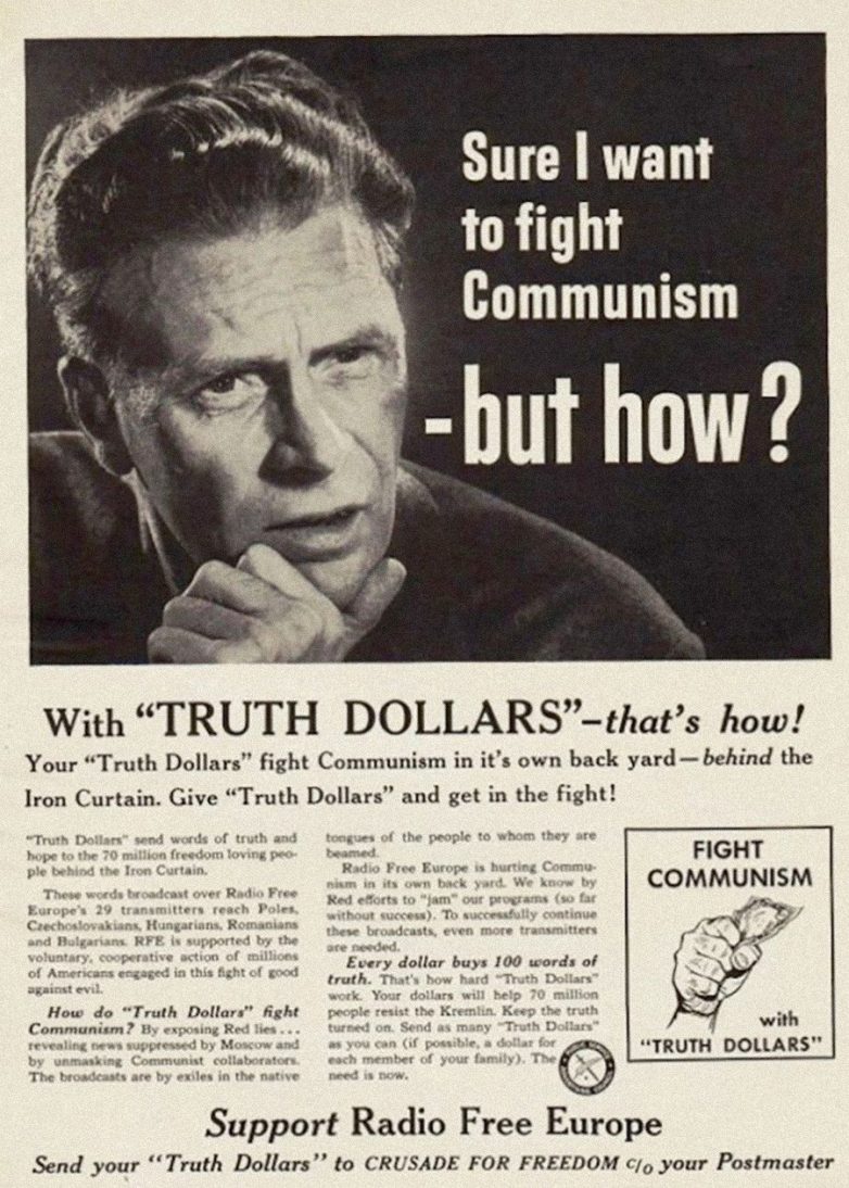 Радио «Свободная Европа» собирало пожертвования, обещая людям крестовый поход за свободу и борьбу с коммунистами от их имени. «Каждый доллар покупает 100 слов правды», — говорится в объявлении.