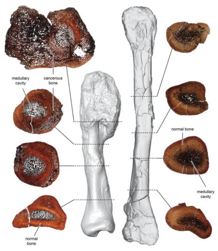 Изначально фрагмент ноги возрастом около 77 миллионов лет показался им плохо восстановившимся после перелома — его форма была изменена до неузнаваемости. Сделав такой вывод, исследователи поместили находку в музей и забыли. Но недавно один из профессоров университета канадского города Торонто решил заново изучить кость и сделал весьма правильное решение. Оказалось, что она была повреждена не переломом, а агрессивной формой рака, которая известна как остеосаркома. Новое открытие открыло больше подробностей о возникновении смертельной болезни и жизни центрозавров.