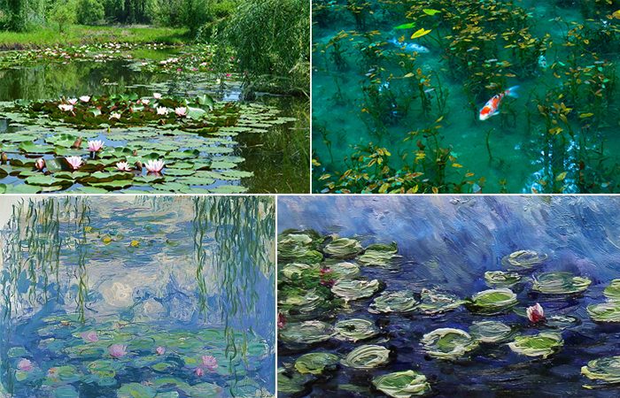 На первом фото в верхнем ряду не картины Клода Моне (даже он так не умел), а реальный пруд у синтоистского храма Nemichi Shine в префектуре Гифу в Японии.
