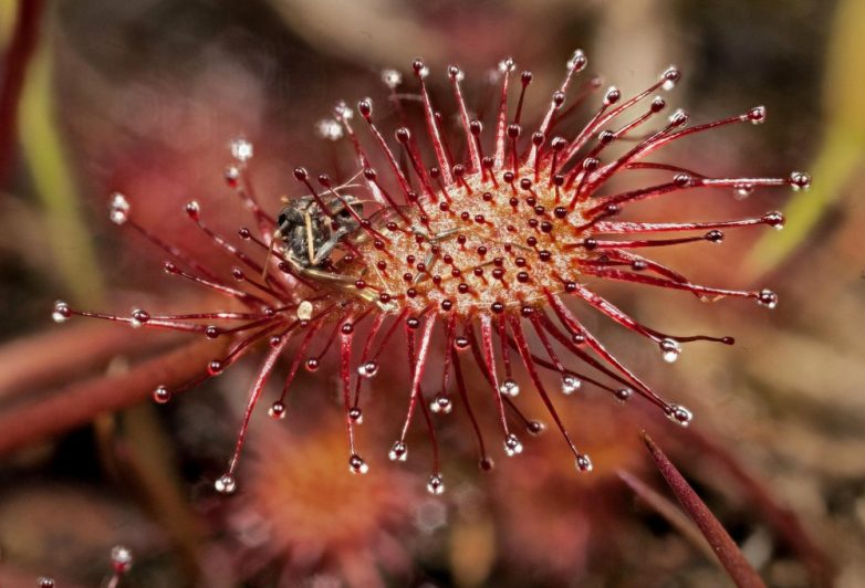 А вот это растение своими глазами видели, наверное, многие. Но, возможно, даже не подозревали, что перед ними — самый настоящий «серийный убийца» насекомых. Листья росянки выделяют клейкое вещество — алкалод кониин, с помощью которого растение и парализует насекомых, имеющих несчастье присесть на него. После того, как это все-таки произошло, края листа росянки закрываются, пытаясь охватить все насекомое целиком, и заживо переваривая его. Интересно, что листья росянки реагируют только на белковую пищу, и «отказываются» от всей прочей «несъедобной химии» — например, от капли воды или от упавшего на росянку листа.
