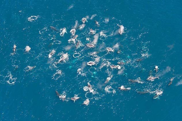 Когда одно исследовательское судно шло вдоль побережья Южной Африки, оно столкнулось с тем, чего никогда с участием горбатых китов не видело. Когда эти млекопитающие собираются вместе, то их редко бывает больше четырёх. А в тот раз вода буквально бурлила среди 200 китов, собравшихся на участке размером с футбольное поле.