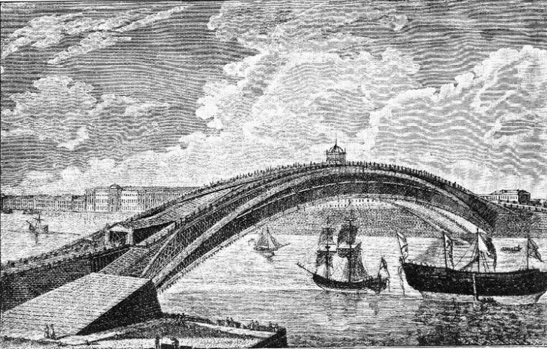 Знаменитый однопролетный мост через Неву — как он мог бы выглядеть, если бы был построен. Его расчет Кулибин выполнял на моделях, в том числе в масштабе 1:10.
