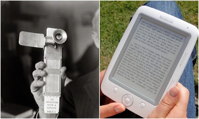 Кто бы мог подумать, что впервые попытались придумать замену бумажной книге почти сто лет назад. Так, в 1922 году была презентована «Машина для чтения Фиске» — гаджет для чтения текстов, изобретенный, как ни странно, контр-адмиралом Брэдли Фиске. Предполагалось, что помимо замены книг гаджет также сделает ненужными очки для чтения. А тексты для машинки изготовлялись с помощью микрофотокопирования печатного оригинала.