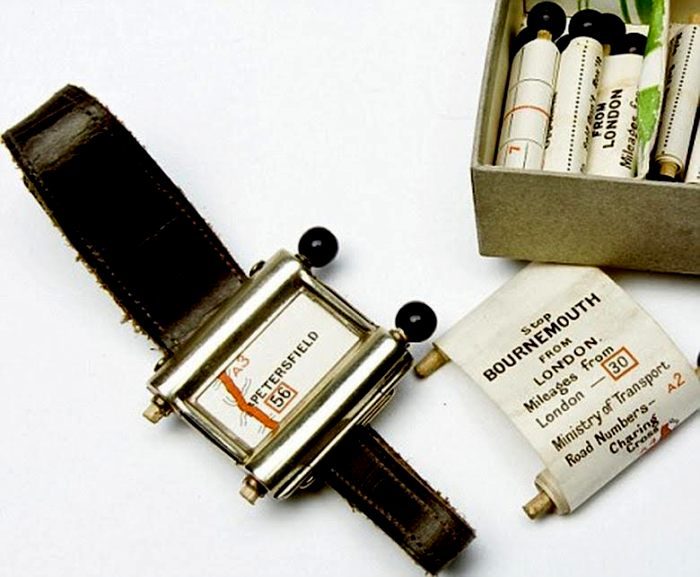 В 1920 году презентовали Routefinder Plus Fours, который, по сути, можно назвать ручным «навигатором». По виду он был похож на наручные часы, однако вмещал в себя бумажные карты и пару деревянных ручек, которые нужно было вращать вручную. Водитель использовал определенную карту, в зависимости от направления своего движения.