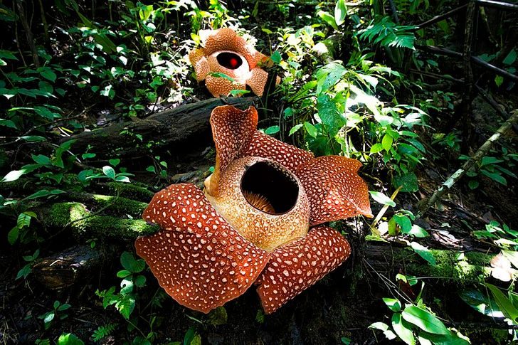 Цветки раффлезии — одни из самых крупных на планете, их вес достигает 11 кг. Пахнут цветы резко и неприятно, почти как тухлое мясо. Раффлезия — растение-паразит, у него нет стебля, листьев и даже корней, а питательные вещества оно получает из организма растения-хозяина.