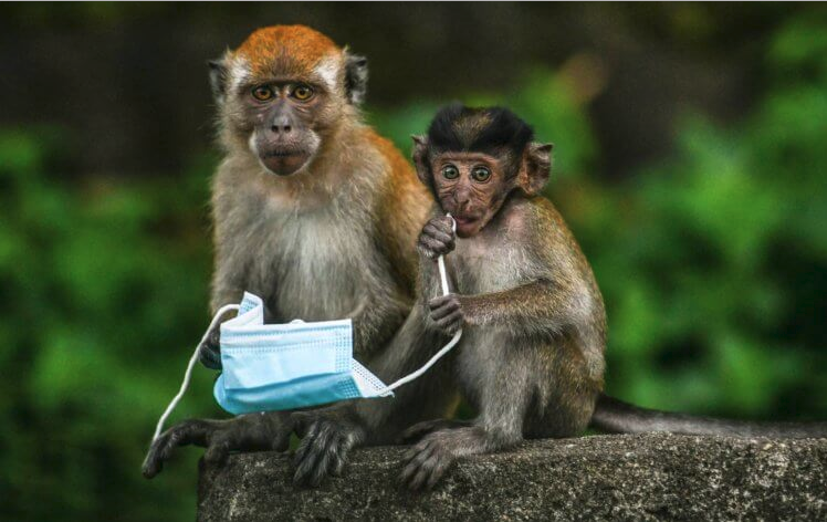 На запечатленном снимке макаки играют с защитной маской для лица, оставленной прохожим в Гентинг-Семпе в Малайзии 30 октября 2020 года. Защитная маски стали частью повседневной жизни многих людей в условиях пандемии коронавируса. Однако экологи опасаются, что эти одноразовые предметы сильно загрязняют окружающую среду. Так, мусор была найден даже в Марианской впадине – самом глубоком месте на планете