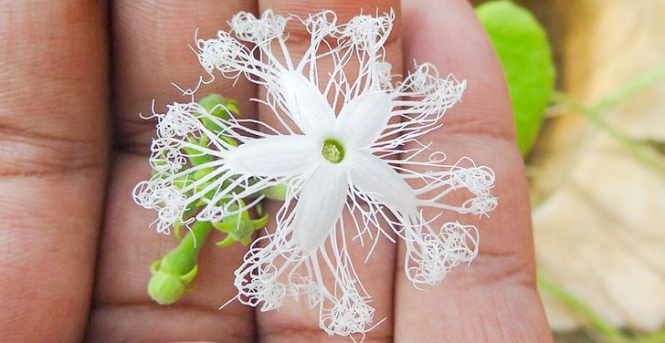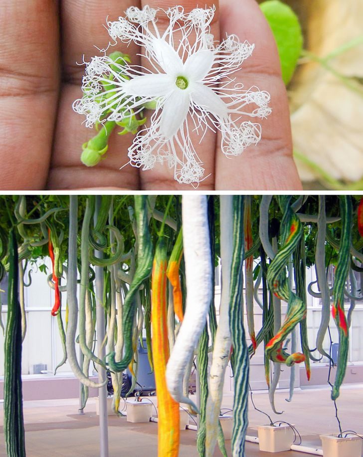 5. Цветок змеиной тыквы похож на кружево, а плод, похожий на змею, вырастает до 1,5 м. Съедобны и плоды, и стебли, и листья, и усики растения