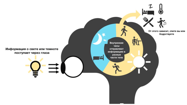 Расположенные в супрахиазматическом ядре гипоталамуса головного мозга, главные часы принимают световые сигналы от сетчатки глаза и отправляют эту информацию в различные части мозга, включая шишковидную железу, которая выделяет мелатонин. Эти сигналы меняются в течение дня, поэтому циркадный ритм человека обычно совпадает с солнечным циклом. Ночью гипоталамус получает сигналы, что уже темно. Поэтому он посылает в мозг сообщение о том, что пора выделять мелатонин, что в свою очередь вызывает сонливость.